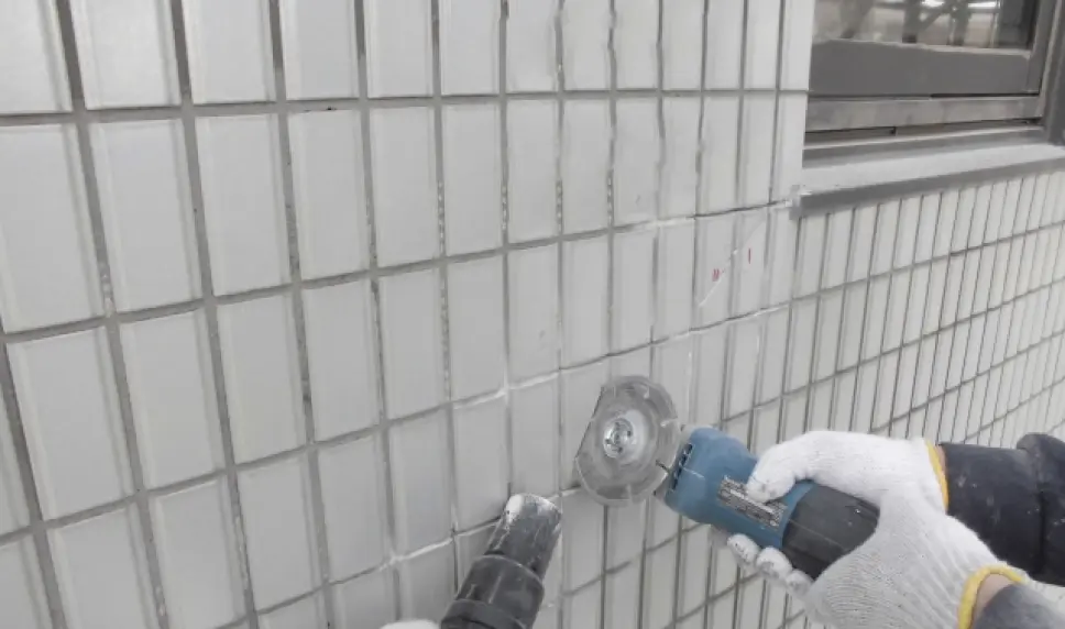 新しいタイルを貼り付ける部分の周辺の目地部から電動カッターで切断します。
