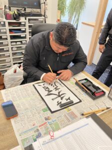 普段はそれぞれの現場に出ているため、全員がそろってゆっくり話す機会は意外と少なめです。書初めの時間では自然と会話も増え、「その言葉いいね」「今年はそこを意識していこう」といった声も聞かれ、和やかな雰囲気となりました。こうした何気ないやり取りが、チームワークを強くしてくれると感じます。