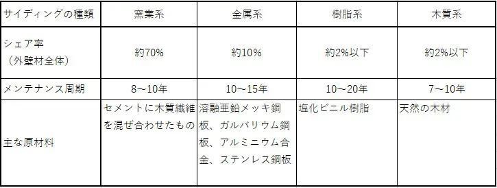 サイディングとは、建物の外壁に張る仕上げ用の板材のことで、種類は大きく窯業系・金属系・樹脂系・木質系に分類されます。